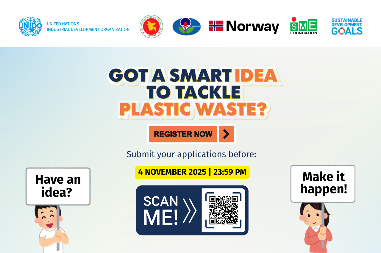 The Cleantech Accelerator and Commercialization Program is a flagship initiative under “Integrated Approach Towards Sustainable Plastics Use and Marine Litter Prevention in Bangladesh”. Designed by UNIDO and the Department of Environment (DoE) with support from the Royal Norwegian Embassy, and in partnership with the SME Foundation, the program empowers innovators to turn their ideas into impactful, market-ready solutions. Read more...