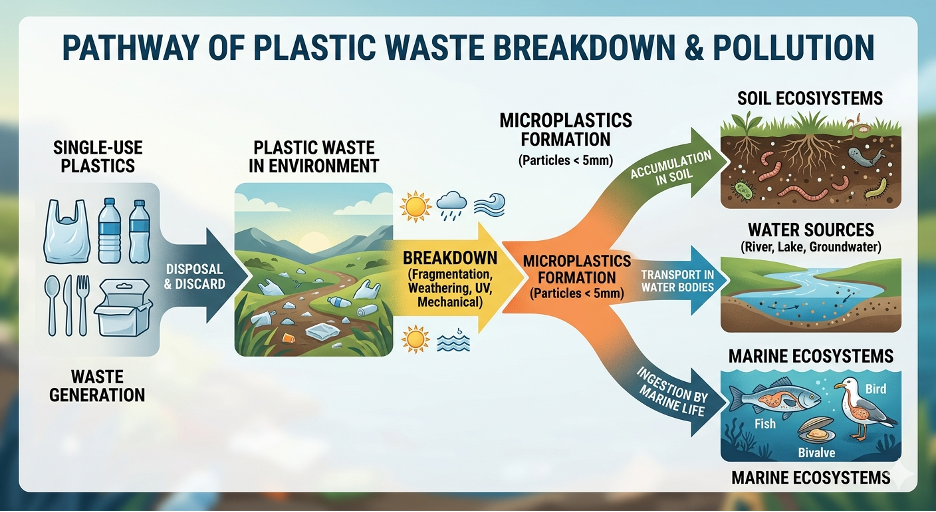 Plastic waste does not disappear after it is discarded. Instead, it breaks down slowly into smaller fragments through sunlight, heat, and physical processes. Over time, larger plastic items degrade into microplastics (particles smaller than 5 mm) and even nano plastics, which persist in the environment.