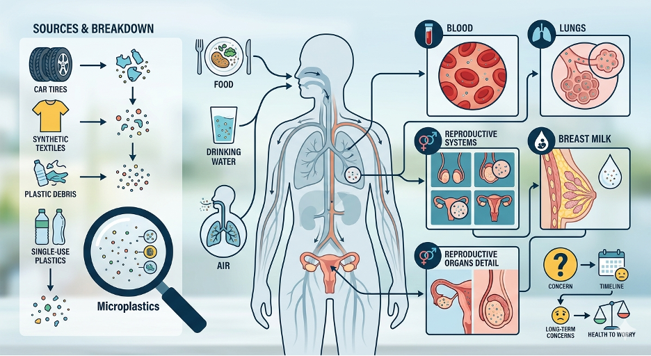 Recent studies have shown that microplastics are now present in the human body. They have been detected in blood, lungs, and breast milk, indicating widespread exposure. Research has also identified microplastics in human reproductive systems, raising concerns about potential long-term health impacts.
